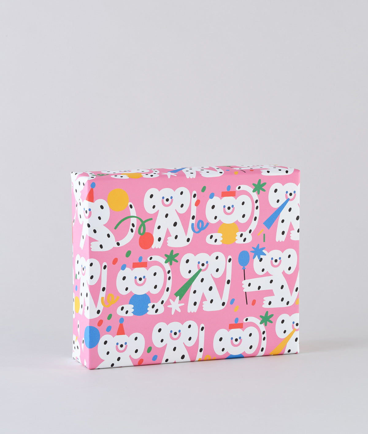 A wrapping paper for cheeky little monkeys. With party hats, birthday balloons, and just a touch of confetti, this design is fun-filled and brightly hued.