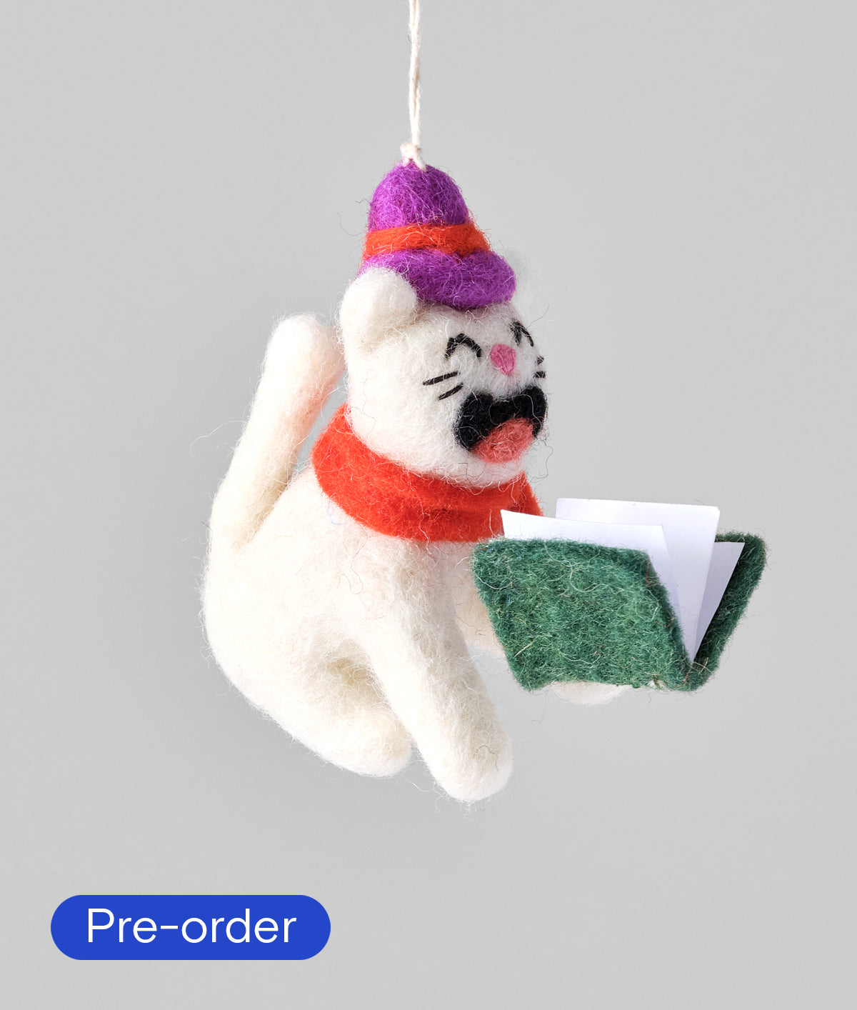 Cute, cuddly, and Christmassy, our hanging tree decorations are back. Designed by long-term Wrap collaborator Elliot Kruszynski these charismatic kitties sport woolly jumpers, peep out of Christmas stockings, or just stand there looking fabulous. Ethically produced in collaboration with a Nepalese development project with 100% fairtrade materials, these felted friends are handcrafted by expert local craftswomen.