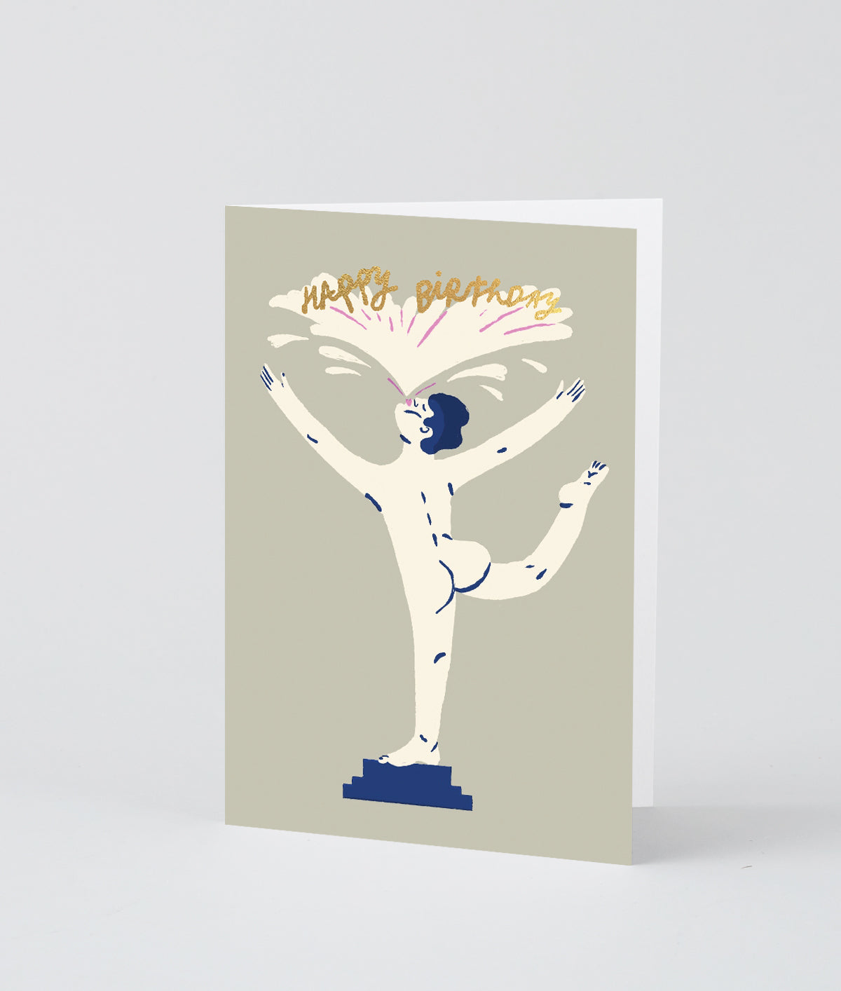 A charming statue in his birthday suit, spouting a jet of gold foiled birthday felicitations. Illustrated by Rozalina Burkova