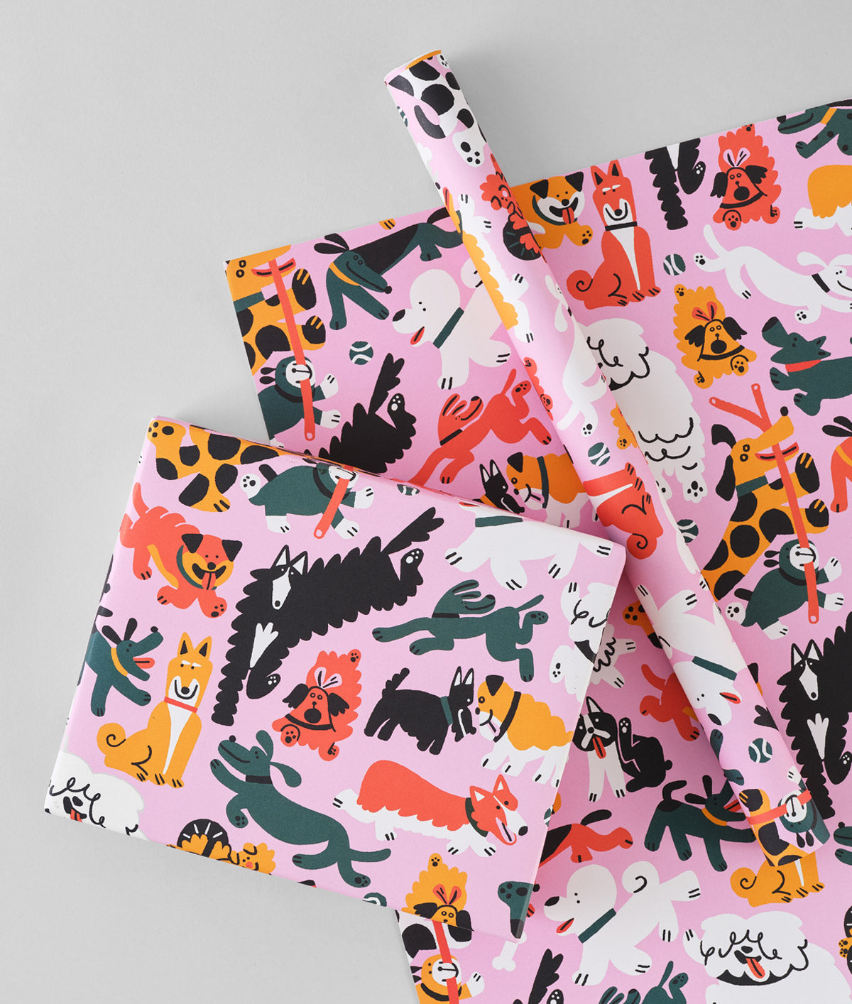 This parade of pups makes a colourful and joyful wrapping paper design. These charmingly fun illustrated doggies have a 'cute n cuddly' appeal.