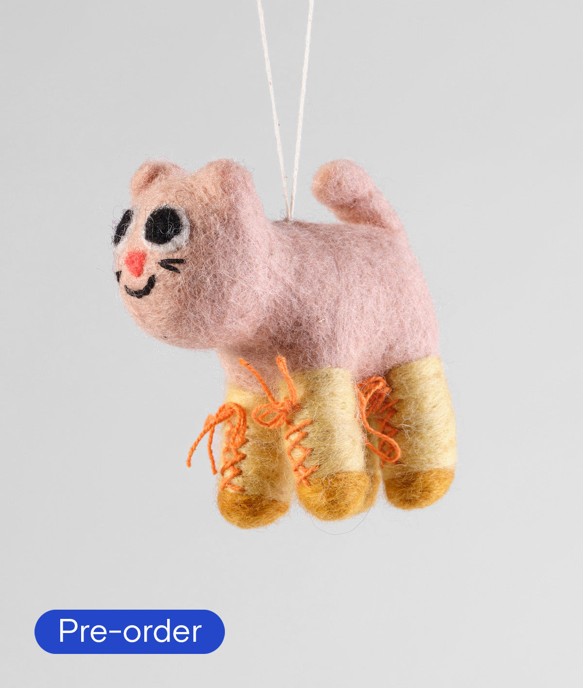 Cute, cuddly, and Christmassy, our hanging tree decorations are back. Designed by long-term Wrap collaborator Elliot Kruszynski these charismatic kitties sport woolly jumpers, peep out of Christmas stockings, or just stand there looking fabulous. Ethically produced in collaboration with a Nepalese development project with 100% fairtrade materials, these felted friends are handcrafted by expert local craftswomen.