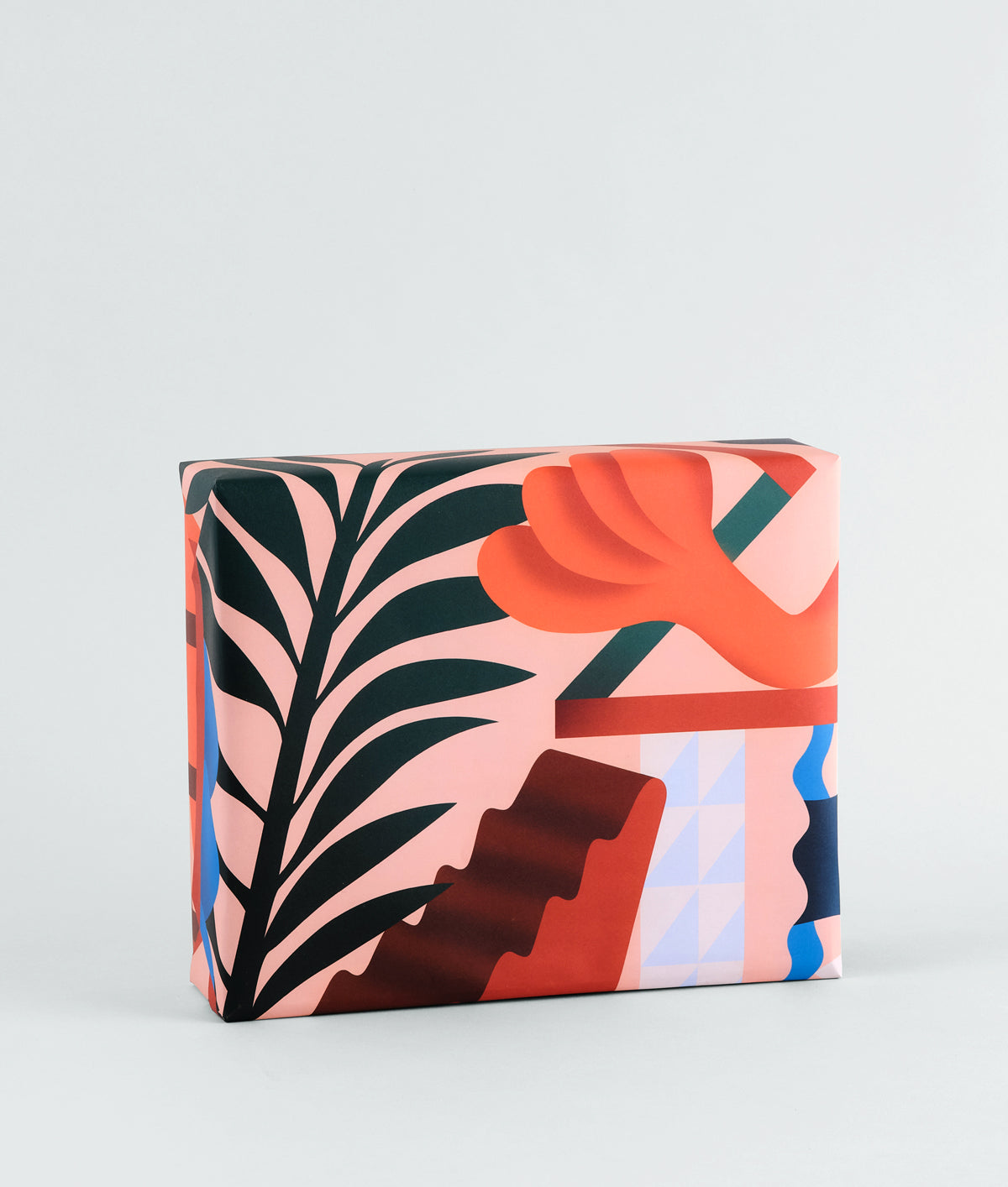 In deep earthy tones and brilliant blues, this wrapping paper is an elegant composition of geometric forms, leafy foliage and abstract shapes. Designed in a bright and bold style.